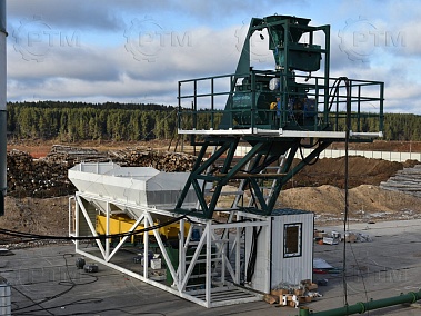 Данный завод производительность от 35 до 45 м3/час товарного бетона марки м200 или раствора. Объём загрузки бетоносмесителя 1200 литров, объем выгрузки готового бетона 800 литров. Один цикл не более 55 секунд. Время работы цикла регулируется оператором бетонного завода.