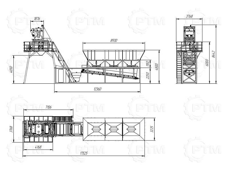 1. Дозирующий комплекс МБ-36 (3 секции по 12 м3): состоит из двух до четырех бункеров для хранения инертных материалов (щебень, песок, отсев). На каждом бункере имеется два пневмо- затвора, необходимых для точной дозации материалов. При дозировании материалы попадают на весовой ленточный конвейер, весовые датчики фирмы CAS Ю.Корея, при наборе нужного количества материалов, заслонки закрываются, подача прекращается. Объем каждого бункера от 2,5 м3 до 20 м3, в зависимости от комплектации завода. Каждый бункер оснащен вибродвигателем MVE 300/3.