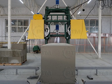 Резка массива газобетона: Резка осуществляется при помощи пильного резательного комплекса с числовым программным обеспечением, кратность резки 100 мм. Стандартные блоки шириной 100 мм, 200 мм, 300 мм, 400 мм. При необходимости можно запрограммировать любую ширину блока.